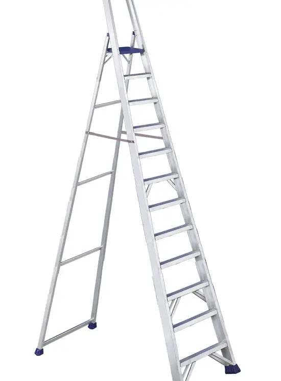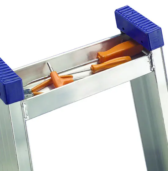 One-sided stepladder, is build with a standard C profile for a lighter (non-intensive) professional use, No. of rungs: 3 to 12, non-skid steps 8 cm. Each step is firmly welded to the frame. It conforms to the European Standard EN131.It includes a reinforced polypropylene platform with a locking safety system, non-slip rubber feet, anti-opening straps, a tool holder, and a full set of equipment designed for safe and ergonomic use, with optional reinforcements available upon request.