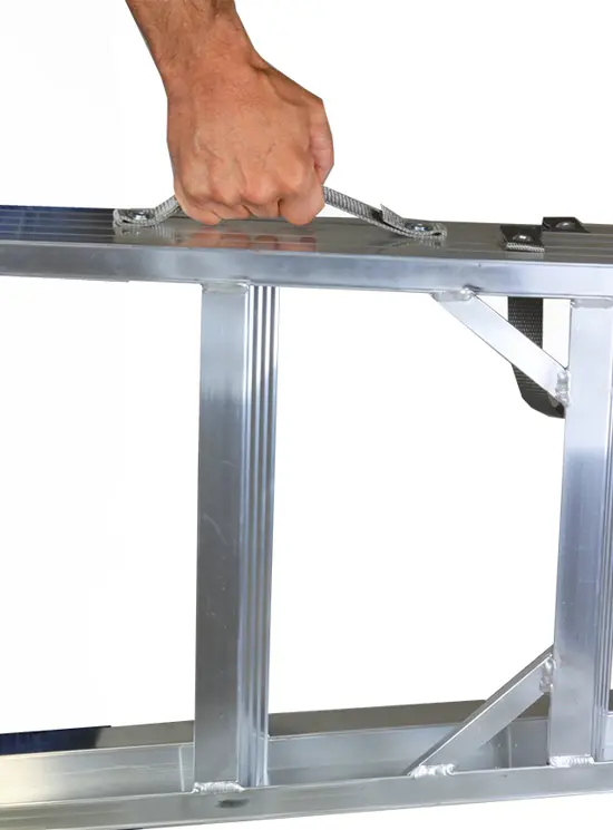 Aluminium ladder, REGINA series, with platform and guardrail, suitable for professional use as well as DIY applications. Each step is firmly welded to the frame.